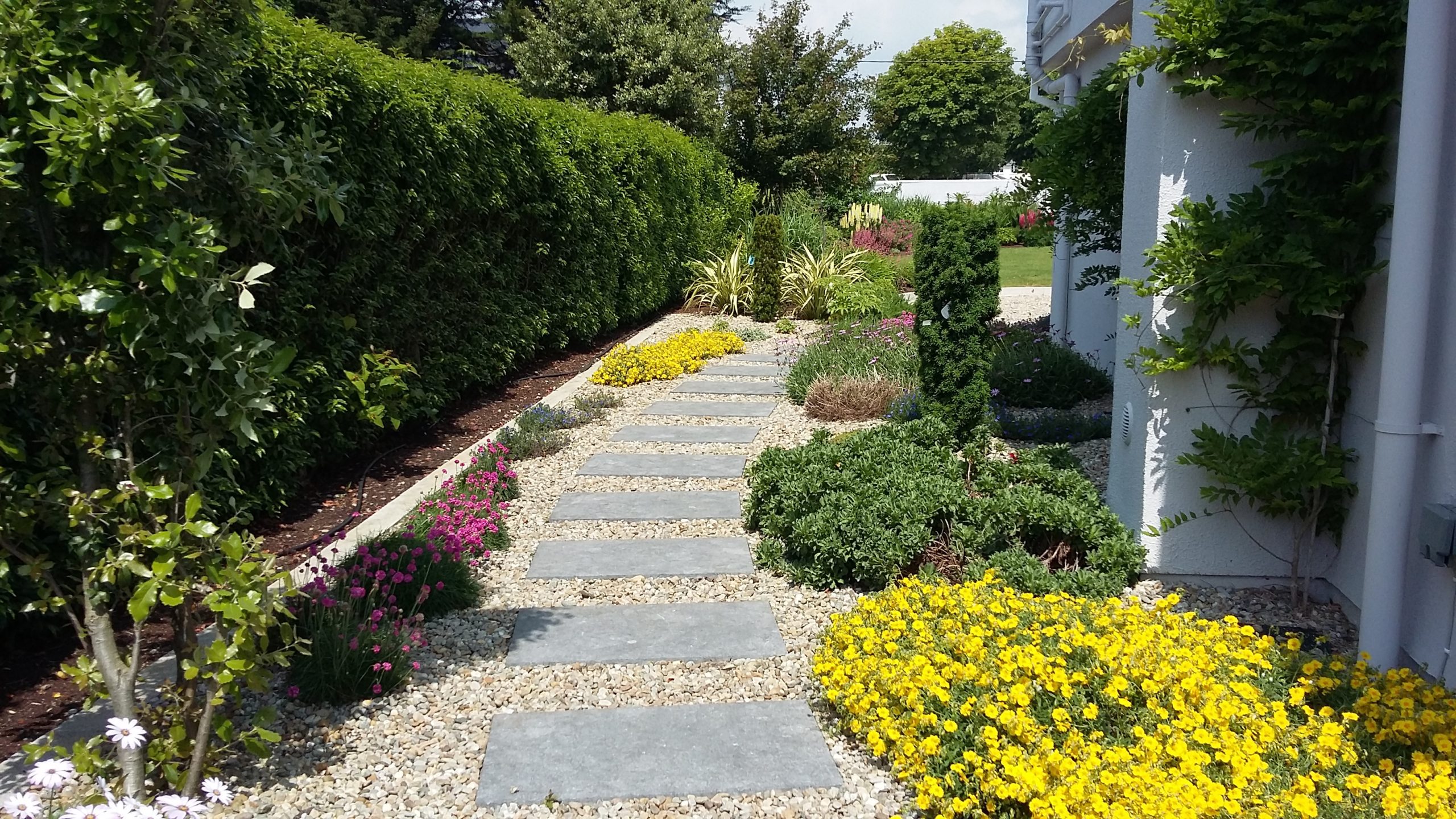 We answered with strong, simple geometry and controlled planting. Formal oval and circular lawns establish soft, uninterrupted curves that lead the eye south toward the bay and hold the space together without visual noise. These lawns are edged with gravel paths that create a clean circulation loop through the garden and connect the house to the south entrance via a secure wall and gate. Outside the paths, layered mixed seasonal planting runs along Ibex fencing and tough coastal hedging. That gives colour, movement, and biodiversity, while also delivering privacy, shelter, and security from the roadside.